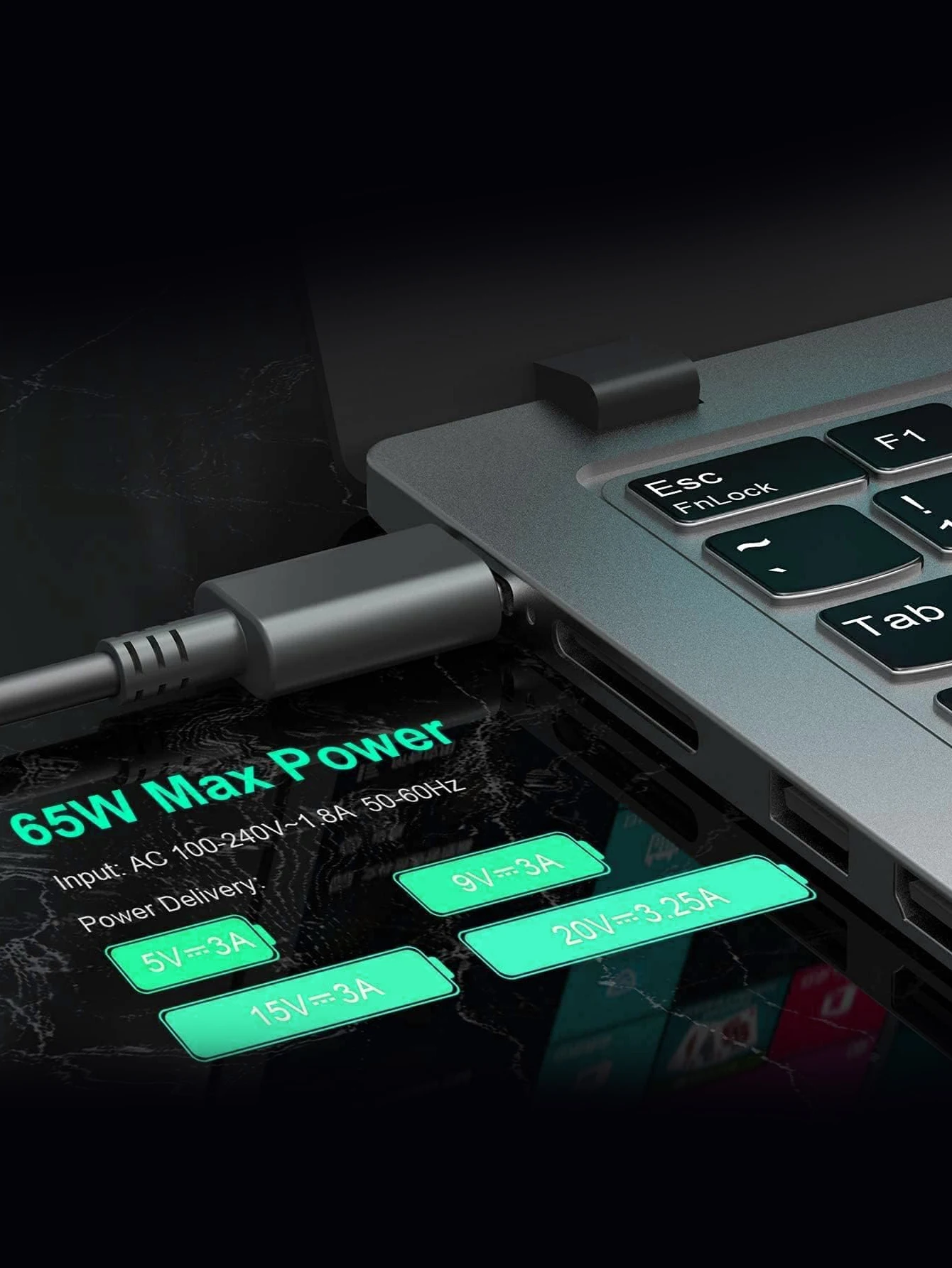 65W USB C Laptop Charger. Input: 100-240V~1.6A 50-60Hz Output: 110-240V,50~60Hz. Output:20V 3.25A 65W.(Also fit for 45W.),also replacement for Dell Hp Lenovo Acer Razer Blade Stealth Samsung Chromebook MacBook Asus Fast Charging Type C Slim Travel Power Adapter
